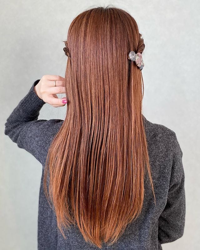 こちらのようにツヤのあるロングヘアをそのまま落として、耳上の毛束だけをねじってピン止めしてみましょう。