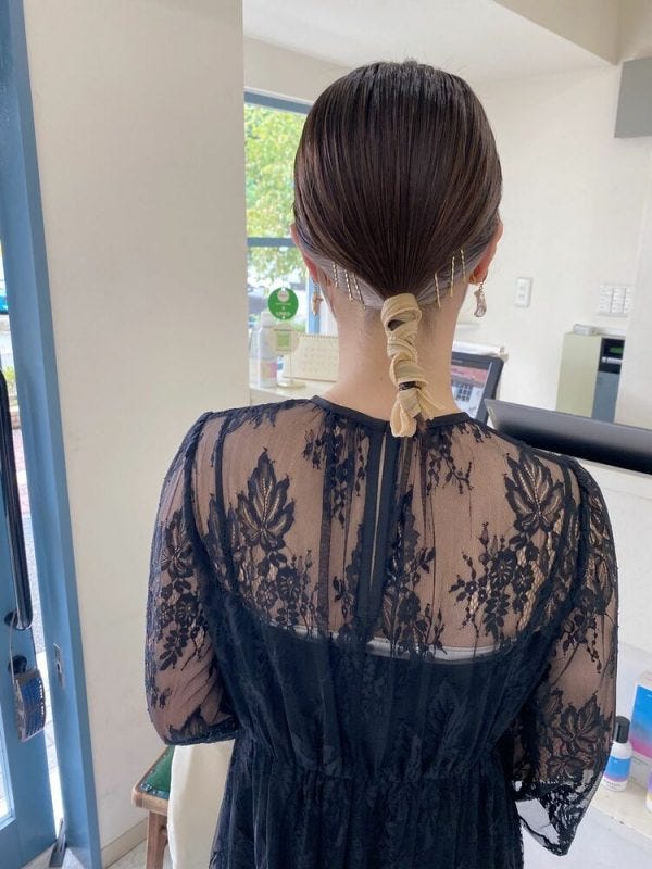 最後にヘアアクセサリーをつけることで、華やかで大人可愛い雰囲気に仕上がっています。毛先をリボンでくるむのもおしゃれですよ。