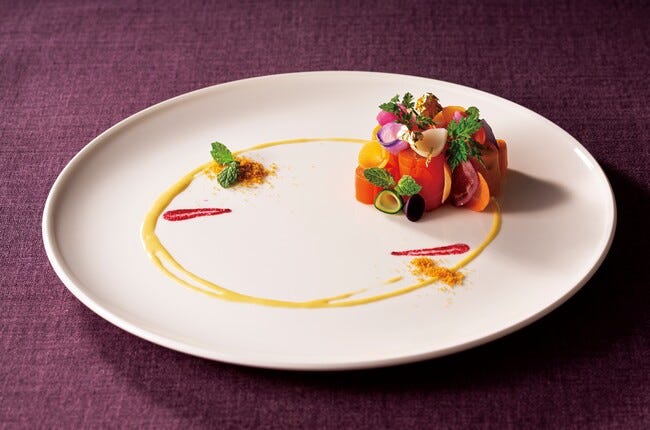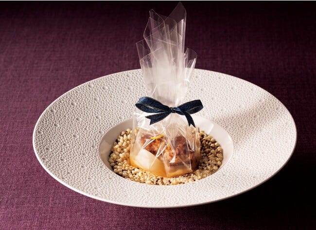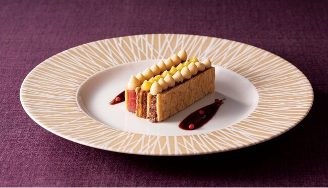 ブーケに見立てた愛らしい前菜をはじめ、冬の贅沢で旨味を凝縮したスープに加えて、まるでミルフィーユ仕立てのお料理など冬らしい食材を用いた驚きとギャップが印象的なお料理の数々です。