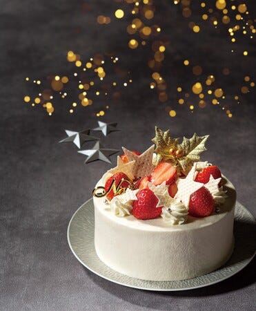 しっとり、ふんわりと焼き上げたスポンジと優しい甘みのクレーム シャンティの中に、甘酸っぱい苺を散りばめました。また銀箔を吹きかけたホワイトチョコレートや全体に散らしたアラザンでキラキラと輝く星を表現し、見た目も楽しんでいただけます。