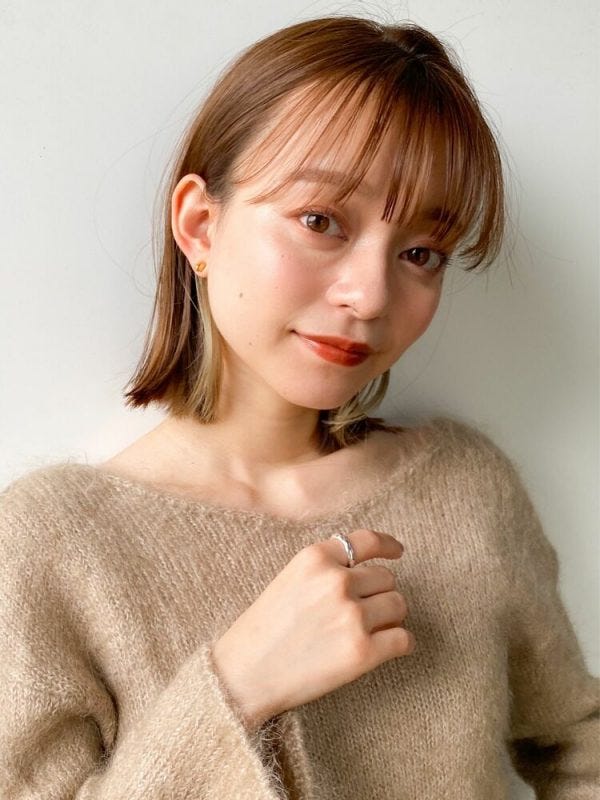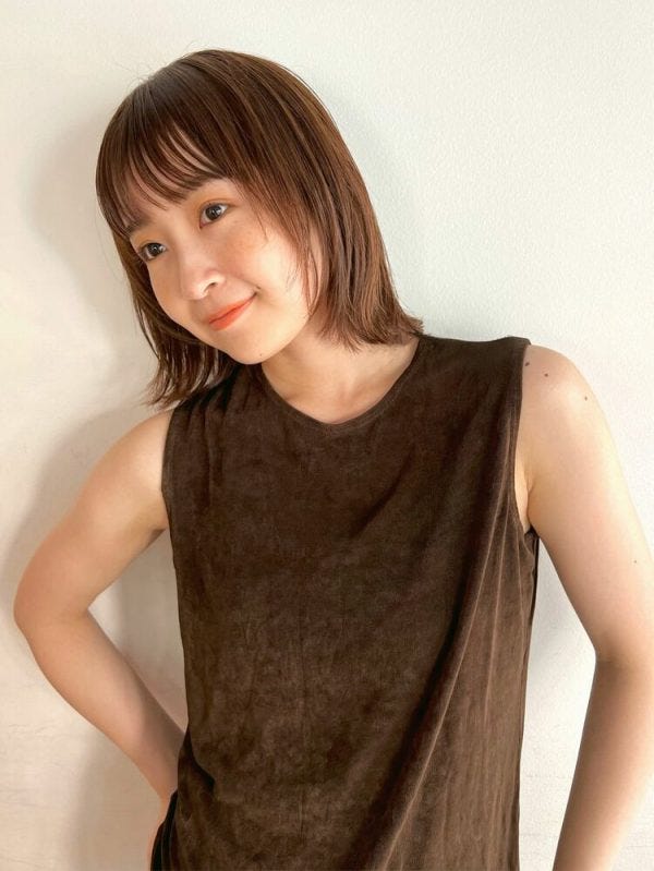大人の女性にはオン眉は似合わないのでは?と思いきや、ストレートボブヘアとの相性がよく40代の女性にもよく似合うヘアスタイルです。