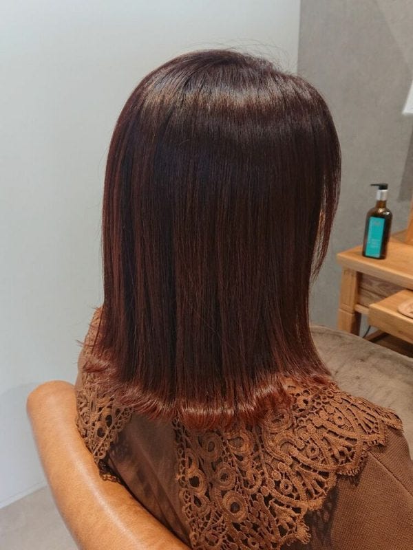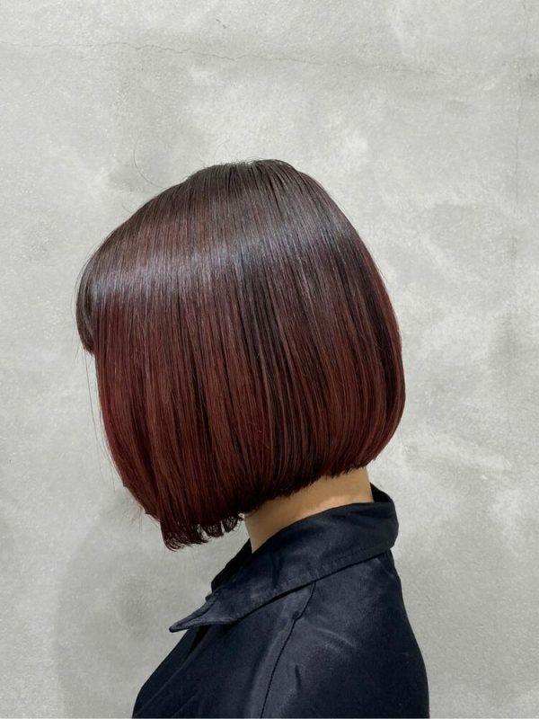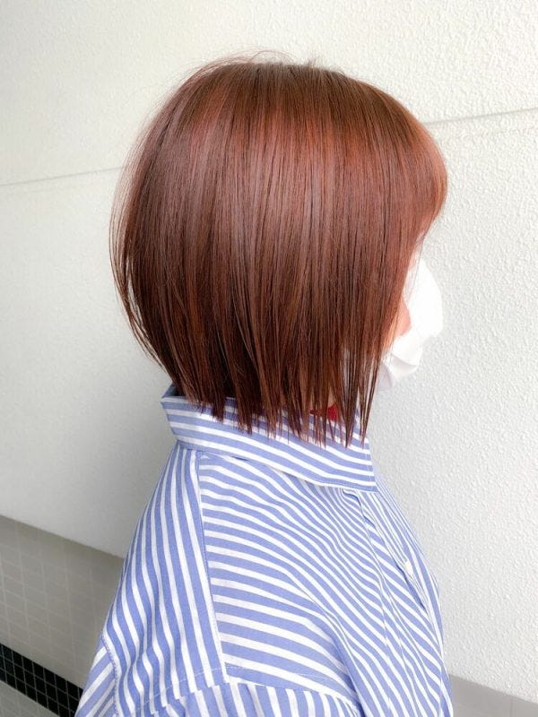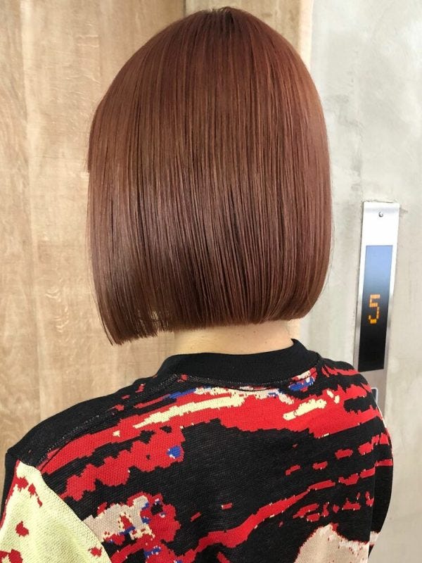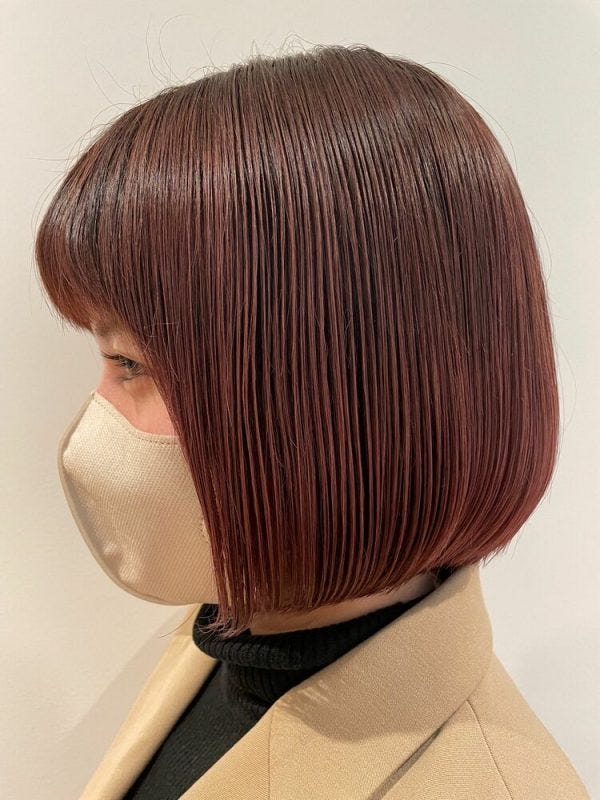 こちらは、シンプルなおかっぱ風の切りっぱなしボブ。ブリーチなしでレッド系のヘアカラーを取り入れているので、落ち着いた雰囲気になっています。