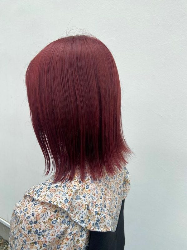 こちらは、ミディアムレングスの切りっぱなしボブに、鮮やかなボルドーレッドを組み合わせています。冬ファッションのおしゃれなアクセントにぴったりです。