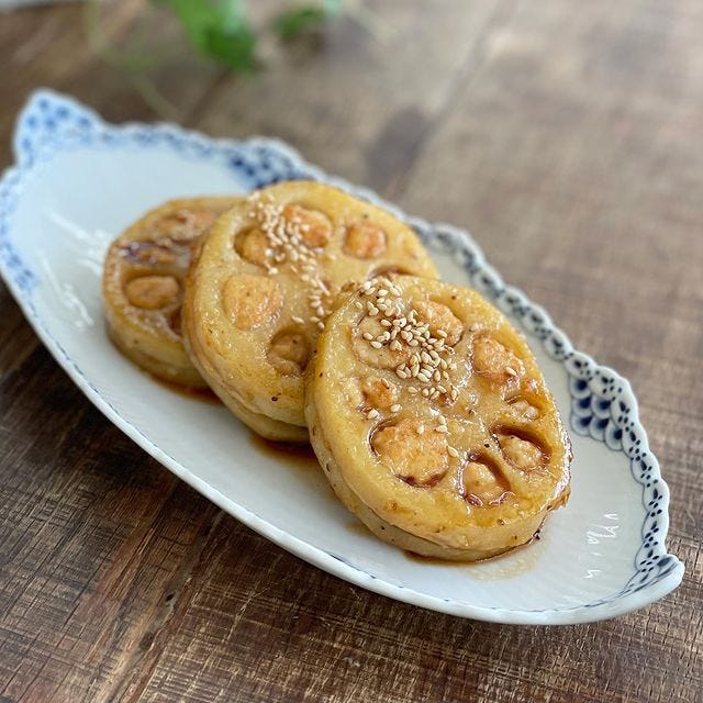 シャキシャキとしたれんこんの食感と鶏ひき肉の旨み、甘辛いたれが絡んで美味しい挟み焼きの献立です。