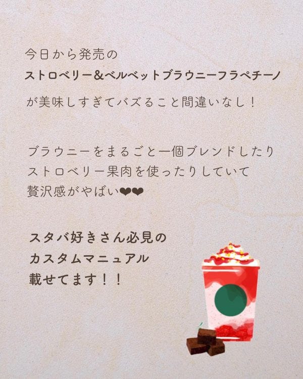 おすすめのスタバカスタムや、新作ドリンクの情報をお届けします。ぜひ、ご紹介するカスタムを試してみてください!