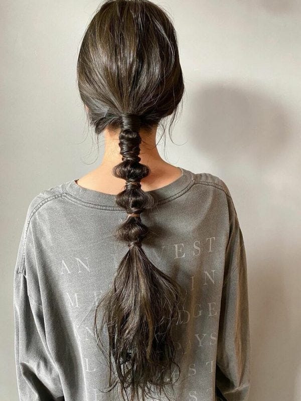 1本のゴムだけで作るポニーテールだと学生っぽく見えますが、玉ねぎ風アレンジを取り入れることでこなれ感を演出できるでしょう。