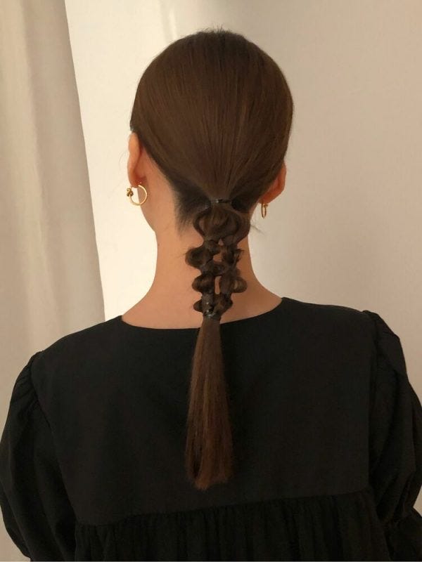 ポニーテールにしてから、毛束を一定間隔で固定するように結んでいくだけなのでとっても簡単ですよ。