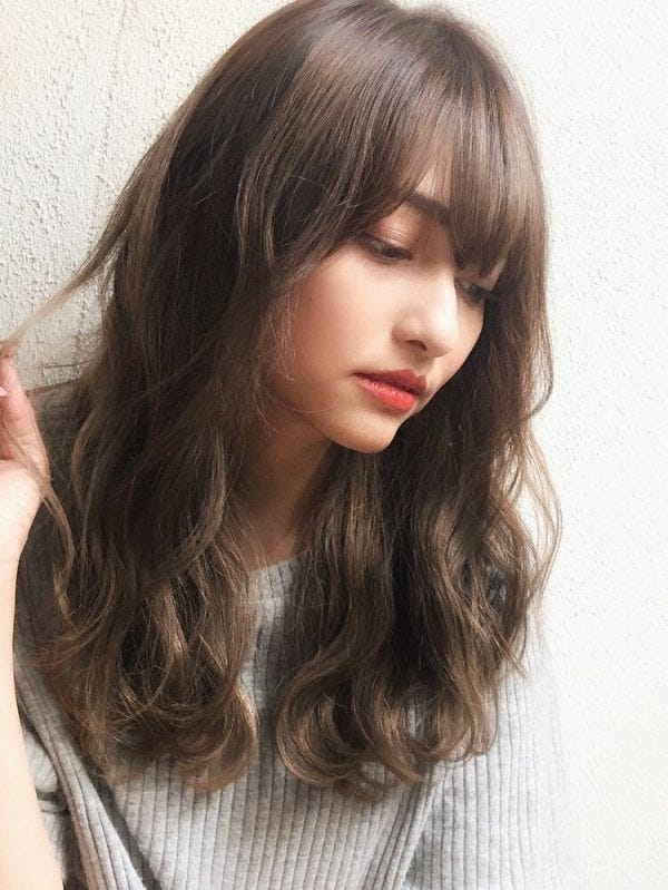 人気のシースルーバングのロングは、髪に動きがあるハチ張りが目立ちにくい髪型です。
