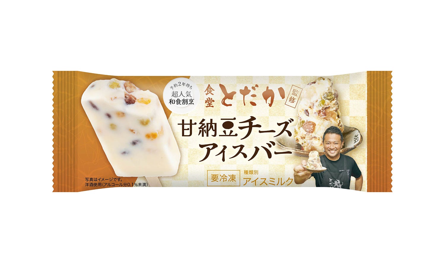 「食堂とだか監修 甘納豆チーズアイスバー」は、「食堂とだか」人気メニュー“甘納豆チーズタワー”をイメージして開発されたバーアイス。