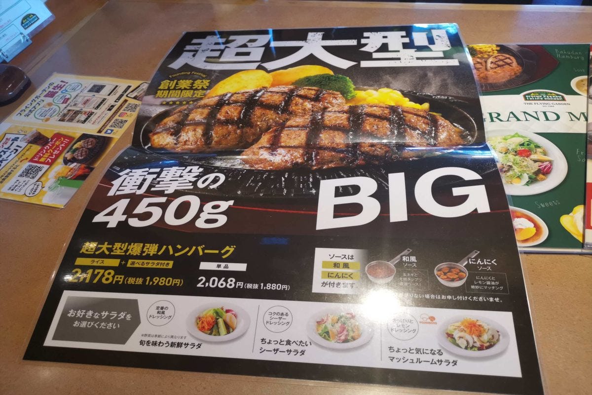 そんなフライングガーデンから満を持して創業祭企画として登場したのが、メニューの表からはわからない「超大型爆弾ハンバーグ」。