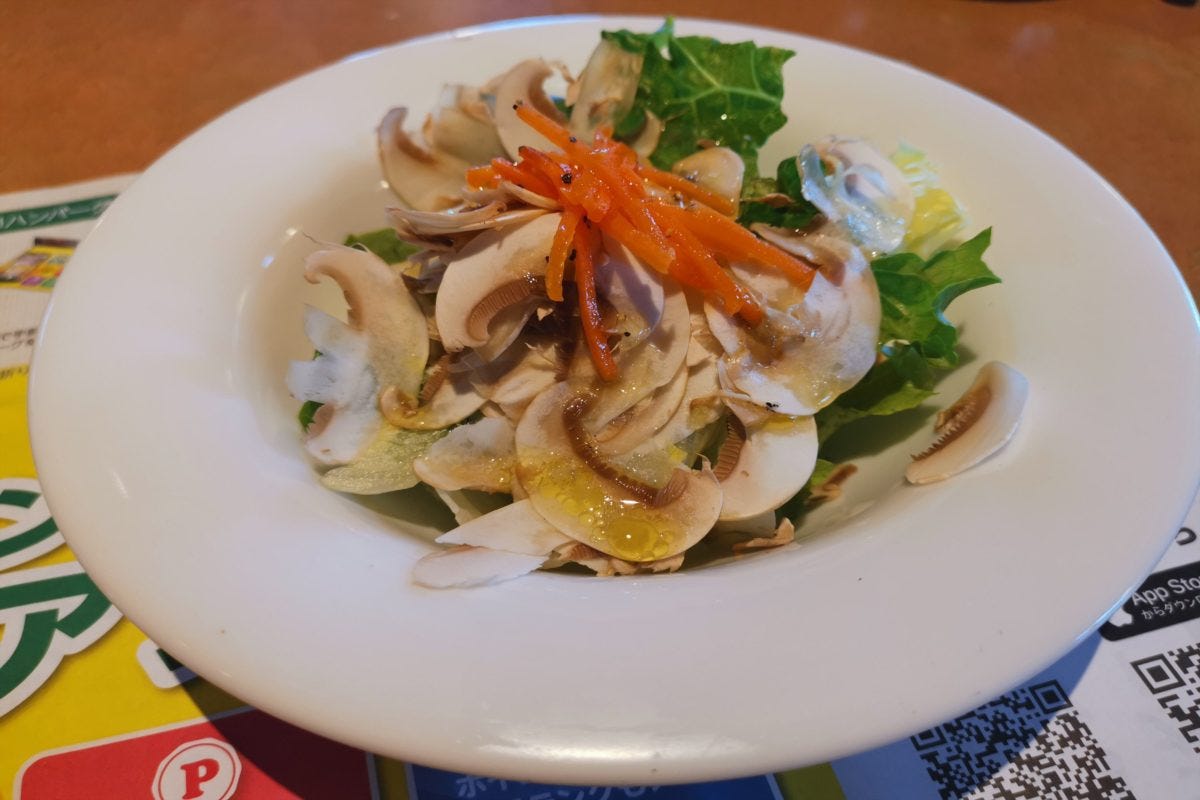 いったいどんなハンバーグが来るのかとワクワクしながらサラダを食べて待つ。このマッシュルームサラダがまたンまいのだ。
