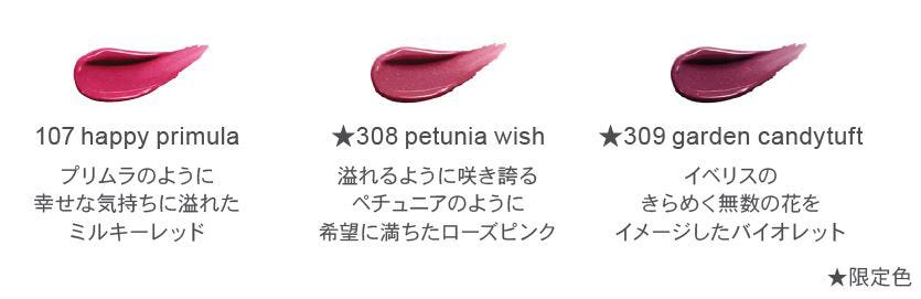 花々の繊細な彩りを表現したルージュ リップブロッサムから、人気の1色と限定の2色がセットになった特別なミニトリオ。ボタニカルワックス配合により、高い密着感、保湿効果や色もちのよさに加え、なめらかな塗り心地とクリアな発色、花蜜のような濃密なツヤ感を叶える。