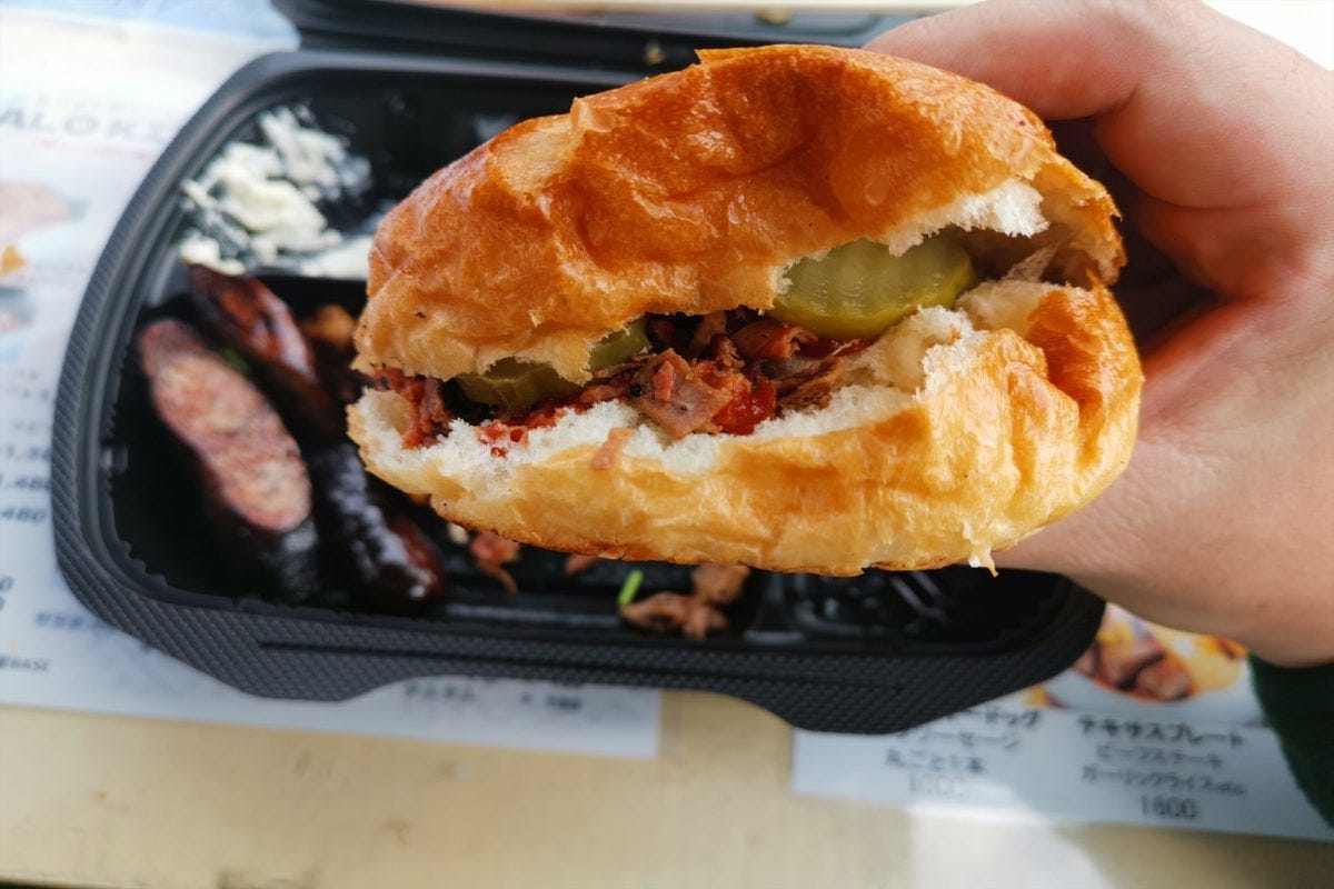 ふんわり柔らかいバンズにブリスケを挟み、ソースを入れて食べても最高。わざわざオースティンまでバーベキューを食べに行かなくても、千葉県まで行けば究極BBQを味わえることが判明した。