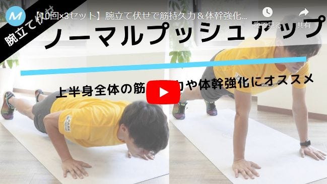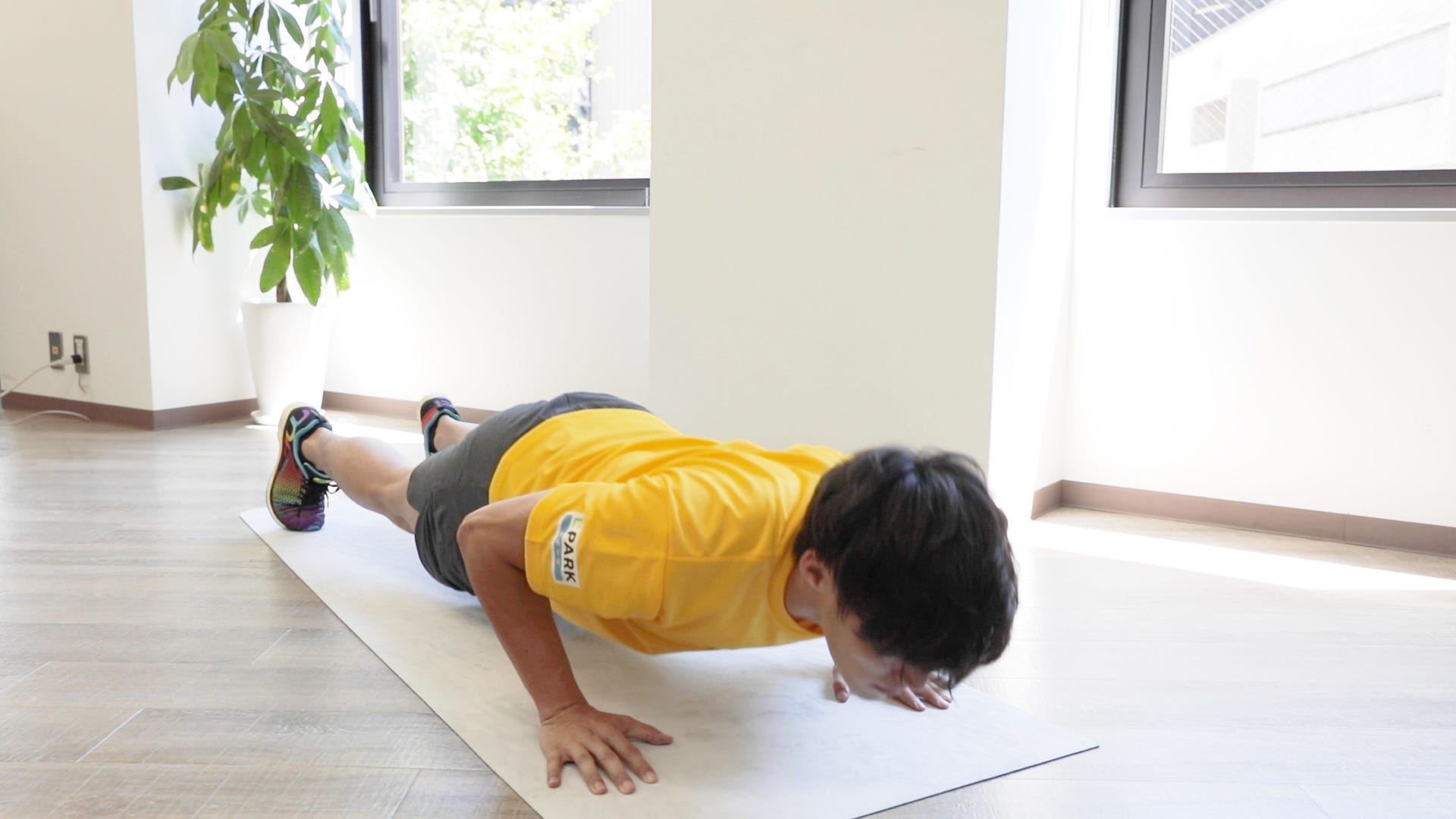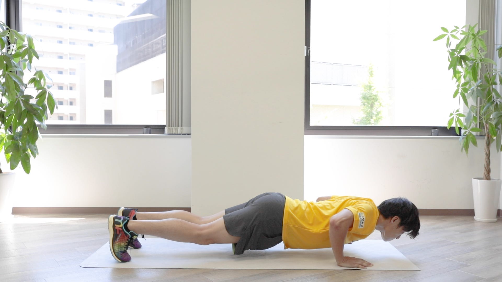 正しいやり方 腕を肩幅より広く床に置き、つま先を立て、腕立て伏せの姿勢になる 肘を曲げ、胸が床につくギリギリまで下ろす ゆっくりと体を起こす