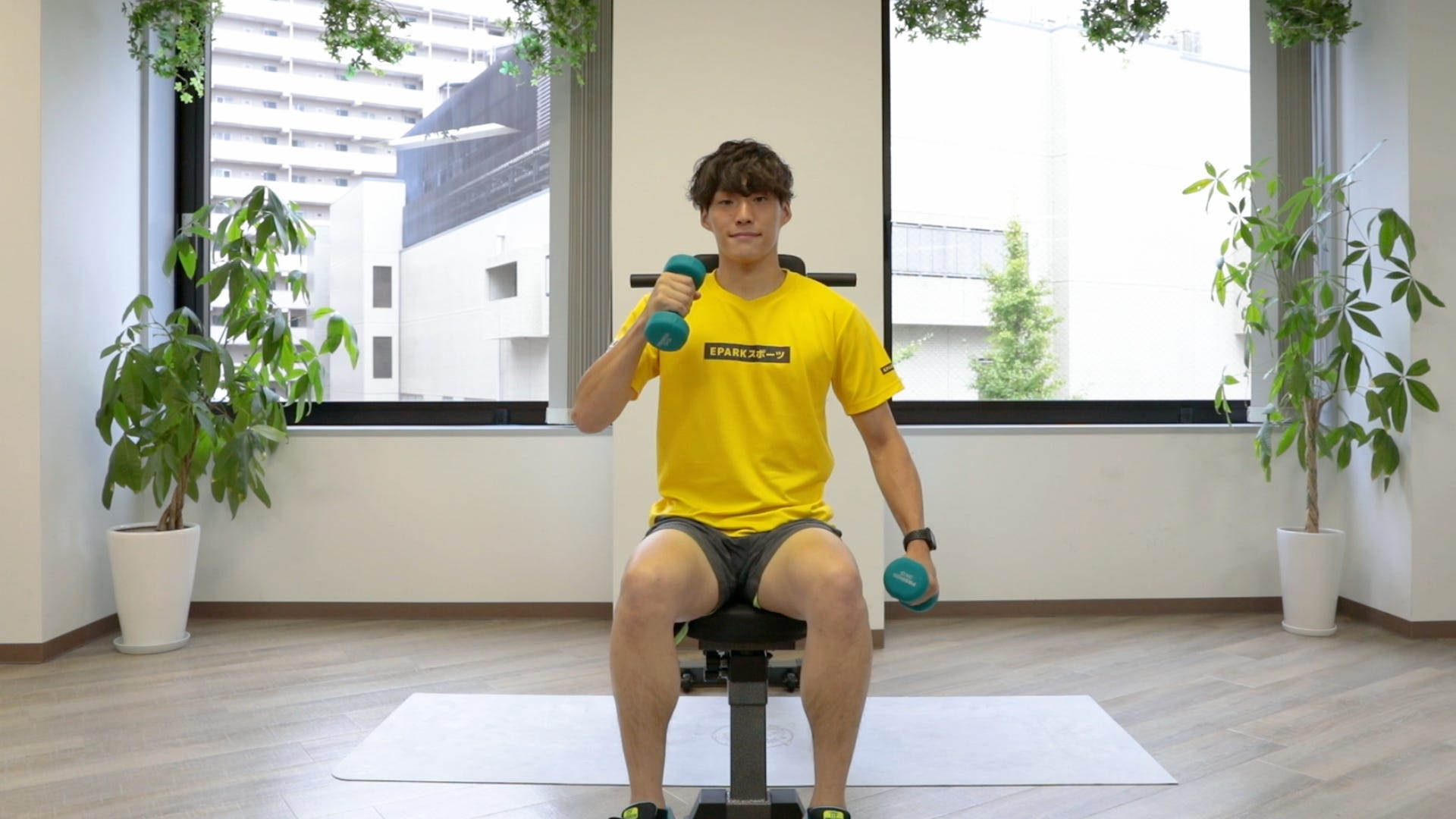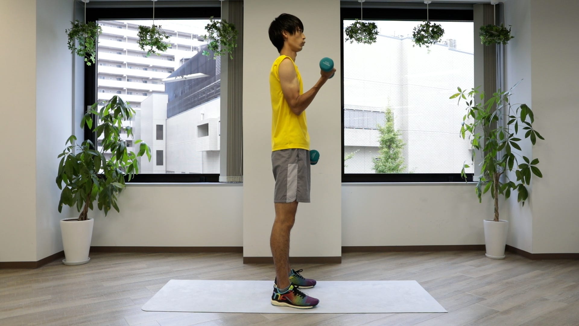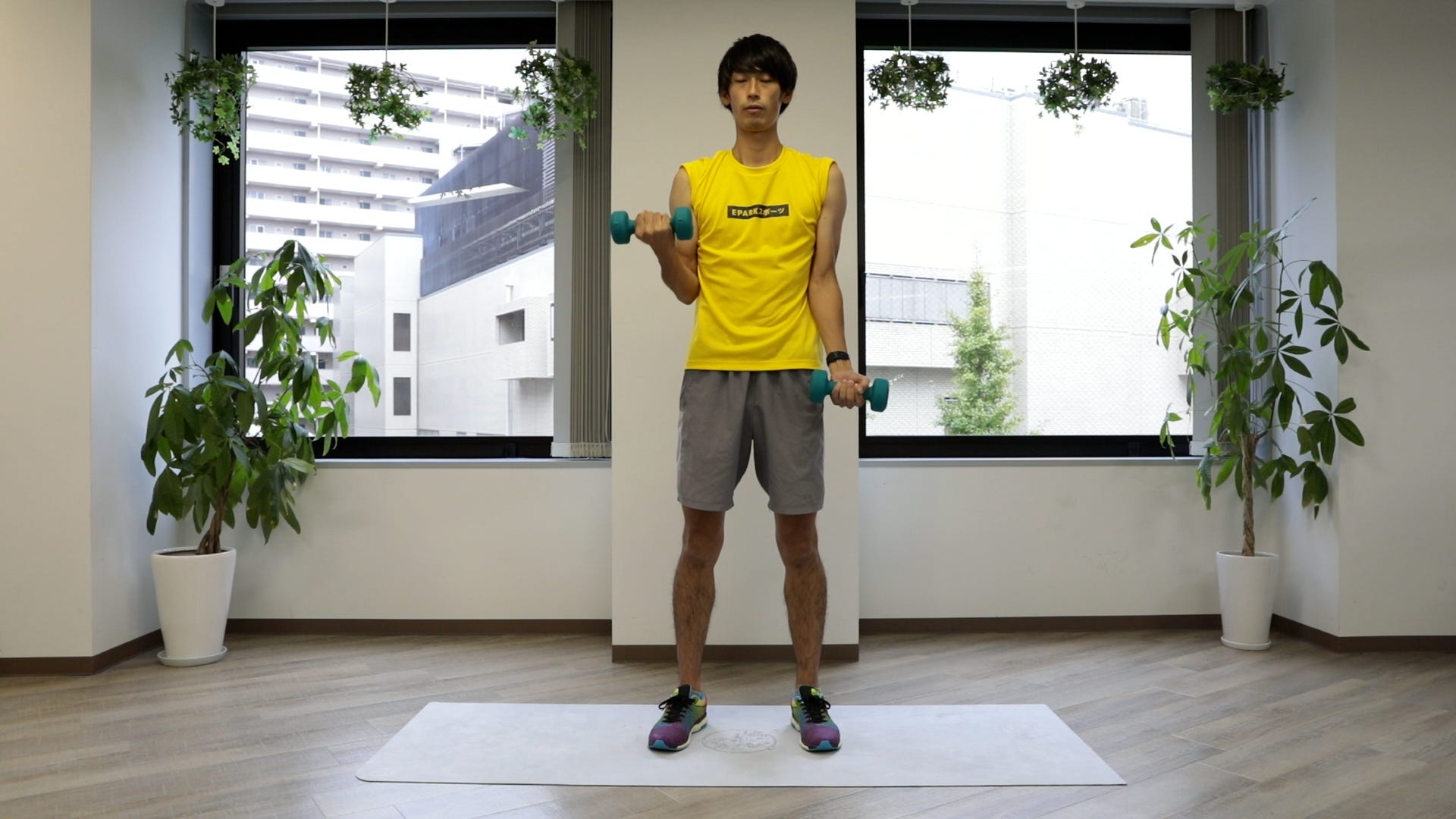 正しいやり方 足を肩幅に広げ、背筋を伸ばして立つ ダンベルを両手に持ち、息を吐きながら持ち上げる 一瞬キープし、息を吸いながらゆっくりと下ろしていく