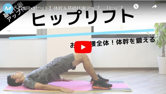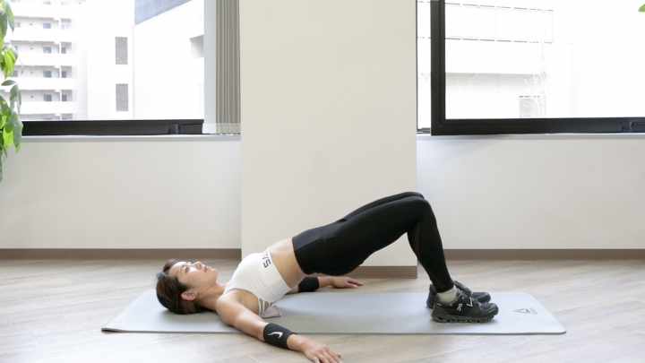 正しいやり方 仰向けに寝て、膝を90度に立てる 肩・腰・膝が一直線になるように、床から腰を持ち上げる お尻を締めるように意識し、姿勢をキープする
