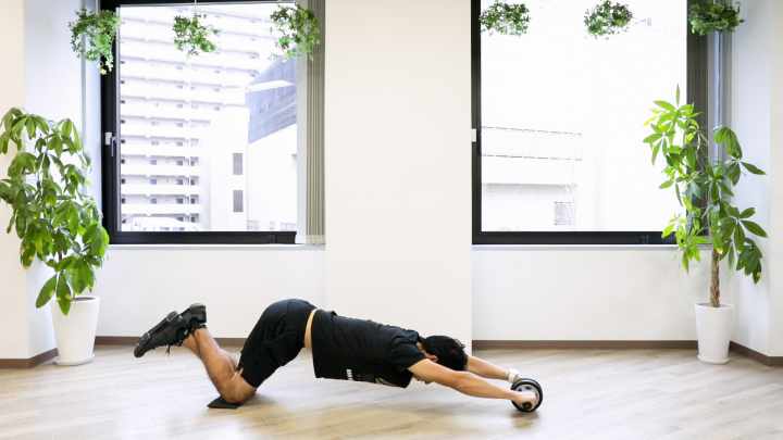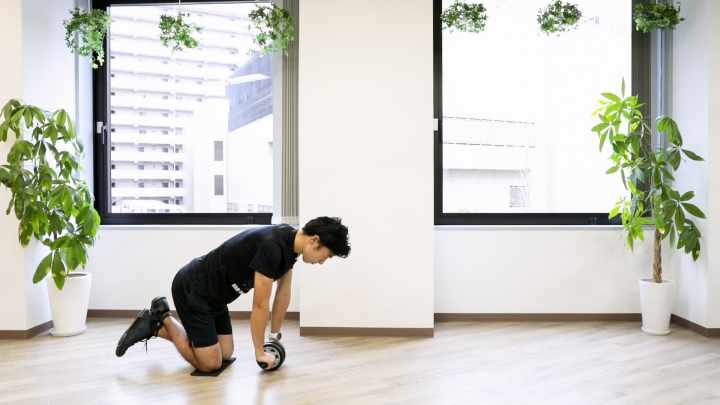 正しいやり方 膝を床につけて、上体がブレないように固定する おへそを覗き込むイメージで、お腹を丸める 反動を使わずに、ゆっくり転がしていく