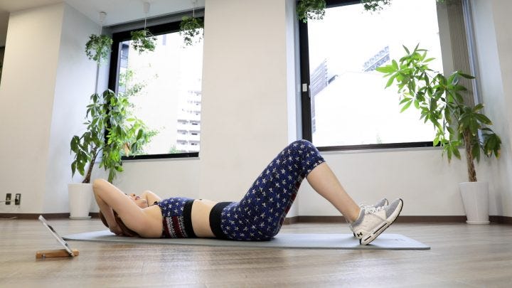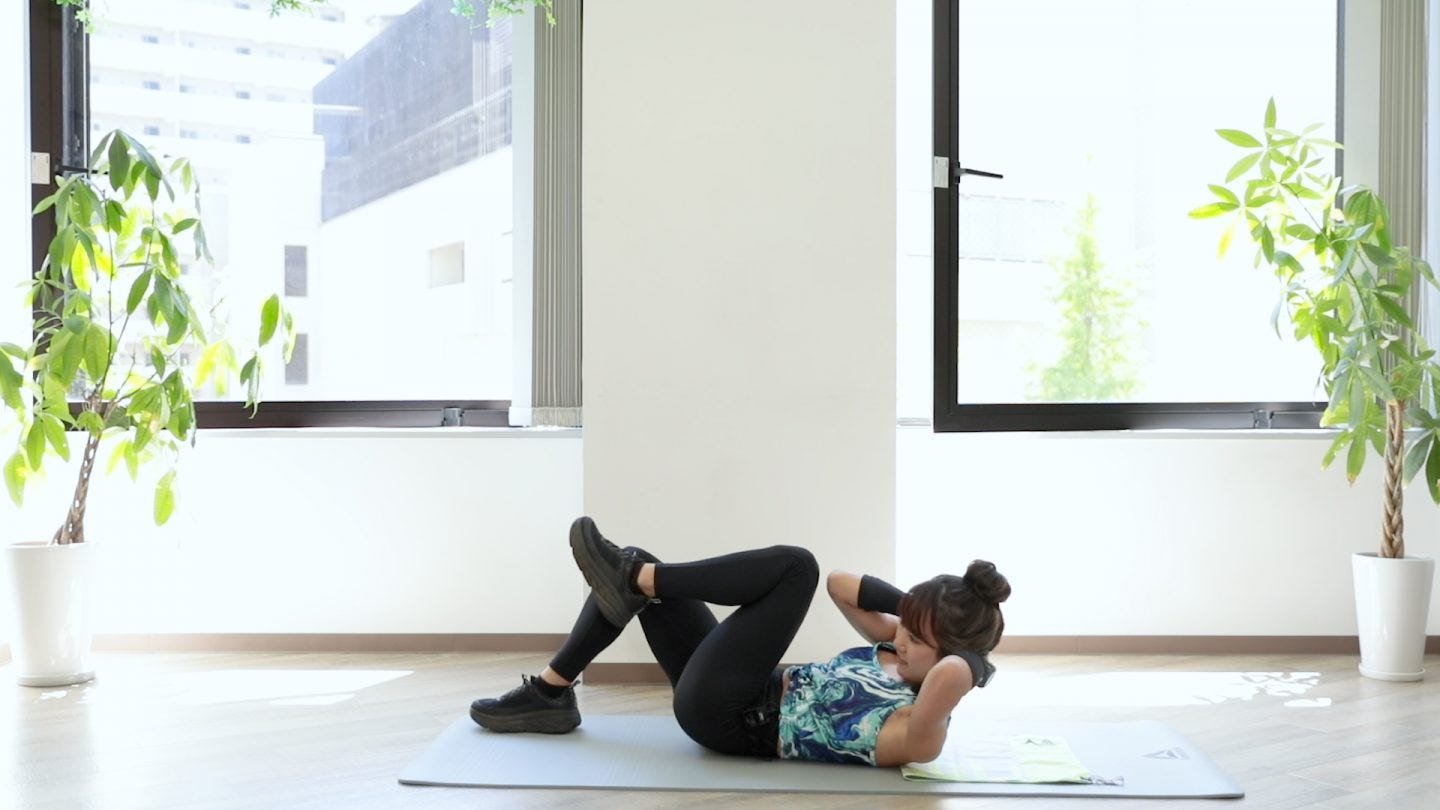 仰向けに横になり、膝を軽く曲げる お腹を意識して、上半身を丸めるイメージで起こしていく お腹を意識してゆっくりと戻していく
