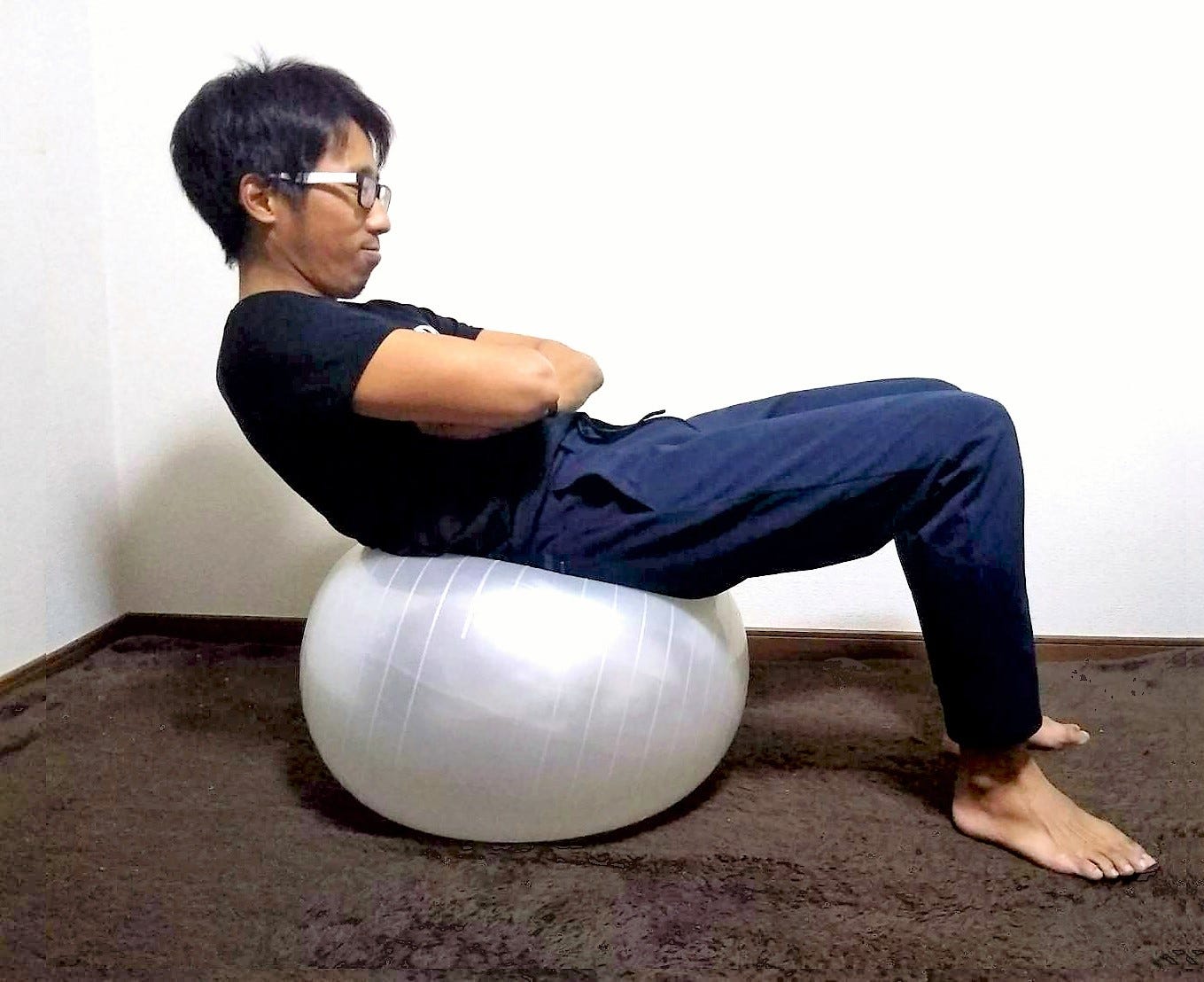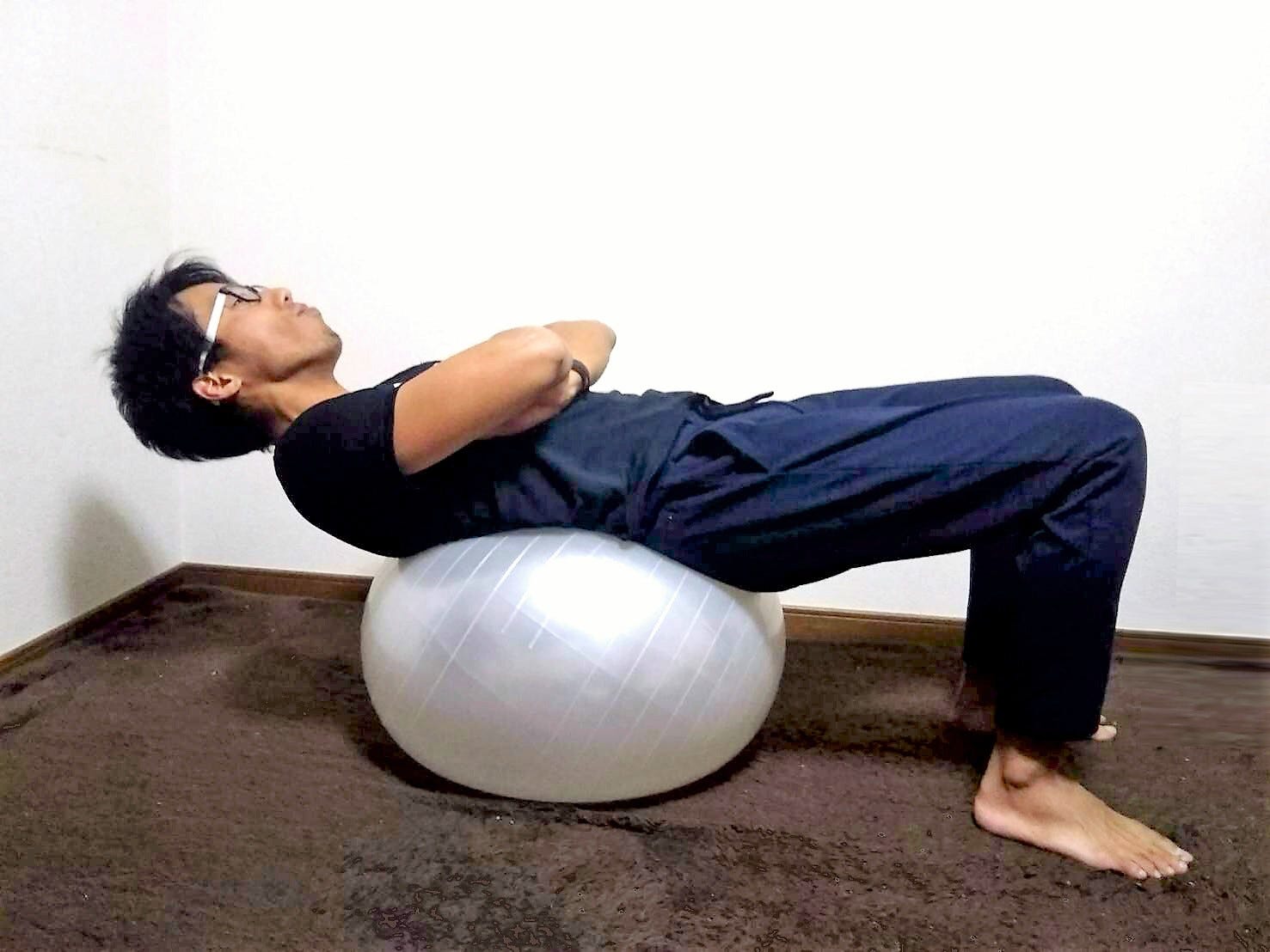 バランスボールに仰向けで寝る 上半身を起こしていく いけるところまで起こしたら、ゆっくりと元の姿勢に戻る