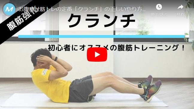 クランチ腹直筋の上部を鍛えます。初心者は上まで起きあがることよりも、反動を使わずに行うことを意識しましょう。