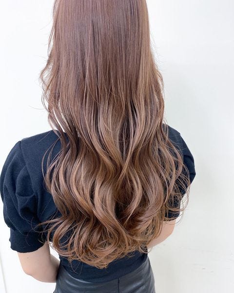 髪の毛にブリーチを1回してから、色落ちしにくいミルクティーベージュを入れたロングのヘアスタイルです。