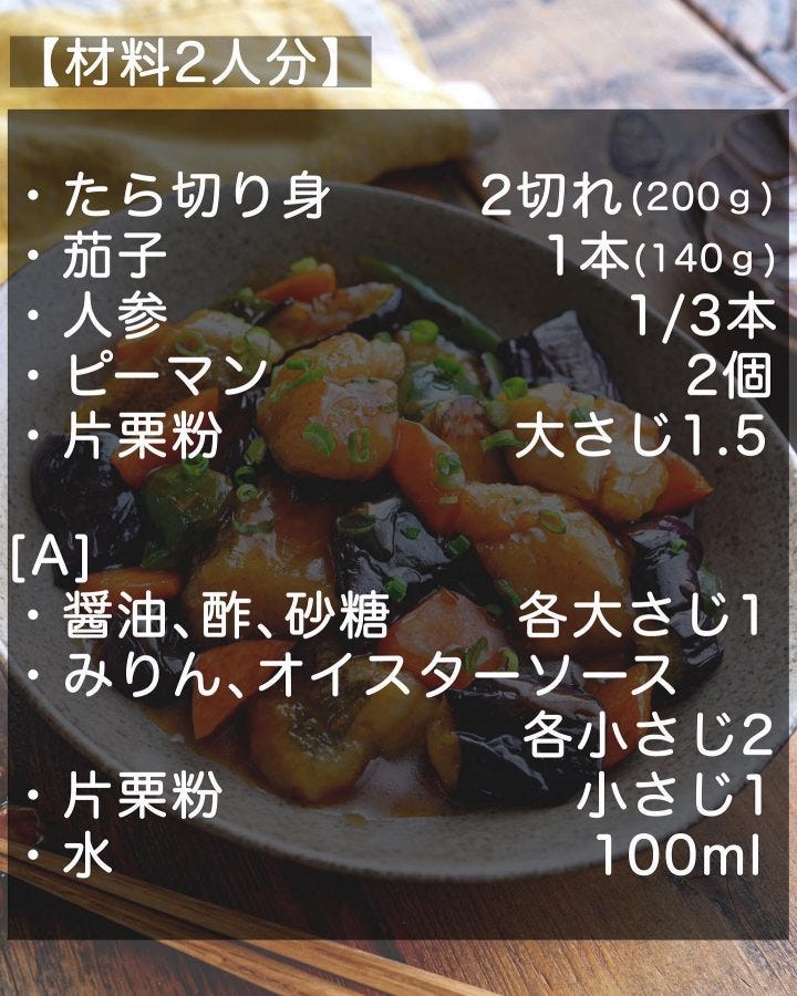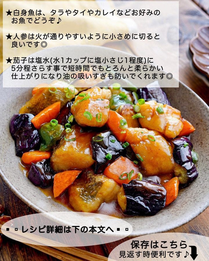 茄子やピーマン、人参の彩り野菜を使って中華風の甘酢あんをたっぷり絡めたお魚レシピです。