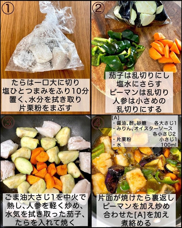 1、たらは一口大に切り、塩ひとつまみ(分量外)をふり、10分置く。水分を拭き取り、片栗粉をまぶす。