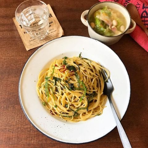 2つの料理を組み合わせることで、栄養バランスも見た目もよくなり食欲のわく献立になります。使う材料はパスタと大葉と調味料だけ。