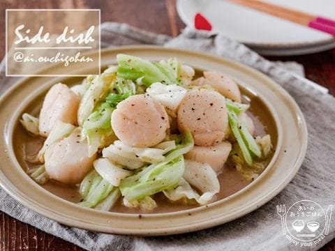 コブサラダの献立に、パパっと簡単にできる副菜を合わせるなら、こちらのホタテとキャベツのレシピがおすすめ。