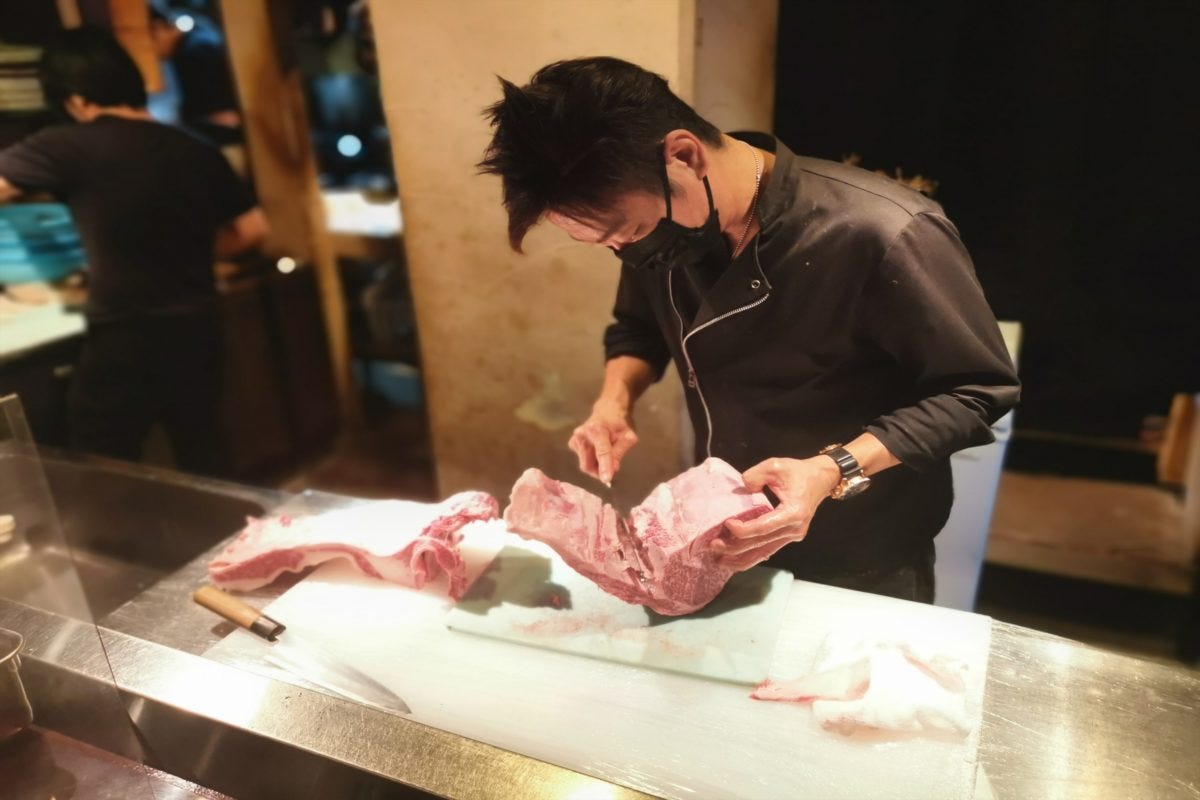 非常に素早い手つきでリブロースをさばく橋本さん。どのような仕上がりになるのか楽しみだ。