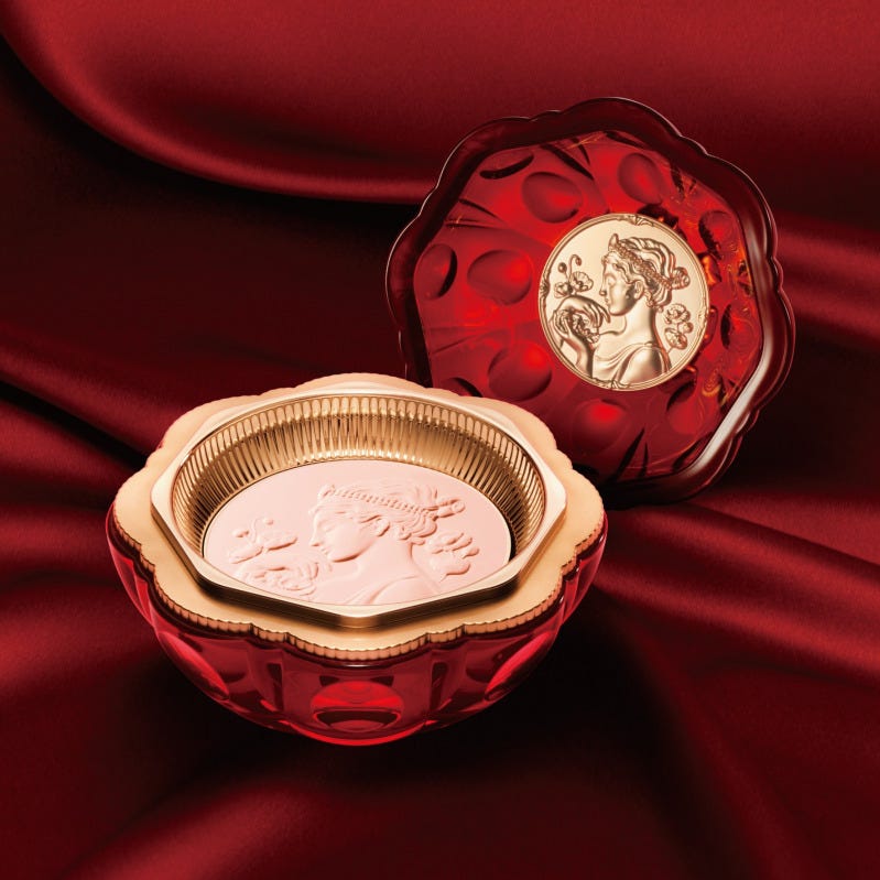 最初に目を引く骨董品みたいな容器は、ベネチアンガラスアーティストのAndy Paiko(アンディ・パイコ) 氏が監修。情熱的に咲き誇る花をイメージした、優雅で芸術的なデザインです。またパッケージの裏面やフェースパウダー表面には「永遠の美の女神」のレリーフが。使う前から目で見て、手で触れて楽しませてくれます♡