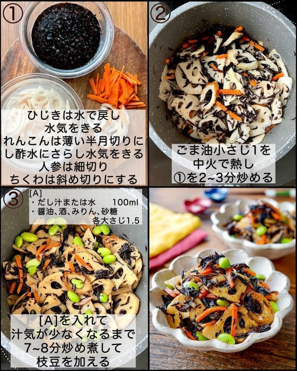 1、乾燥芽ひじきは水で戻して水気をきる。れんこんは薄い半月切りにし酢水にさらし水気をきる。人参は細切り、ちくわは斜め切りにする。