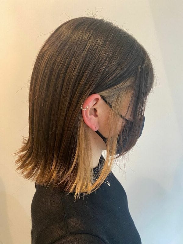 ナチュラルな切りっぱなしのベルボブに、人気のインナーカラーやイヤリングカラーをプラスすると、おしゃれ度が上がりますね。