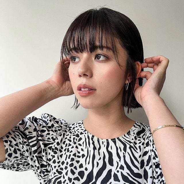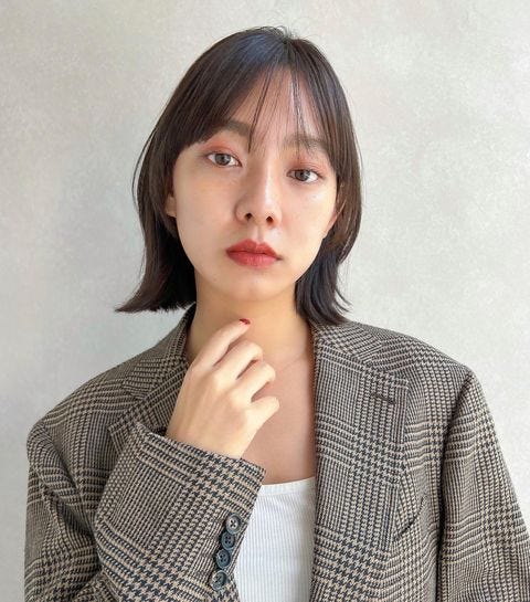 前髪はアイラインでカットし、顔周りに毛束が沿うようなレイヤーも入っています。