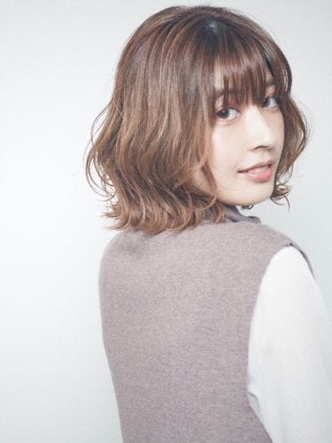 ワンレングスにカットした肩先の長さのボブに、ラフなウェーブを施したヘアスタイルです。