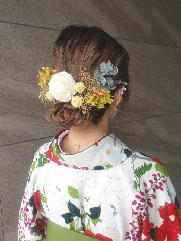 あえてルーズにセットすることでこなれ感を演出します。華やかなフラワーアイテムを挿して、特別な日の装いにしましょう。