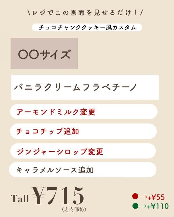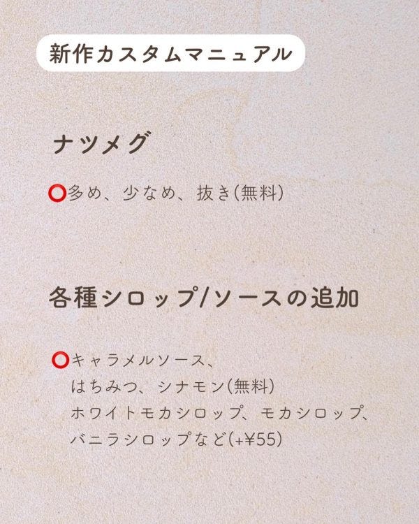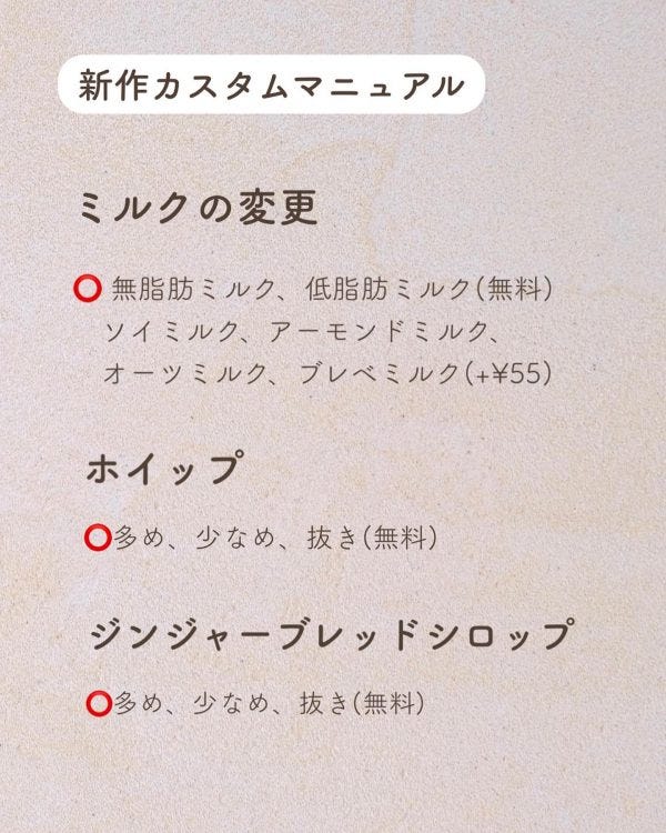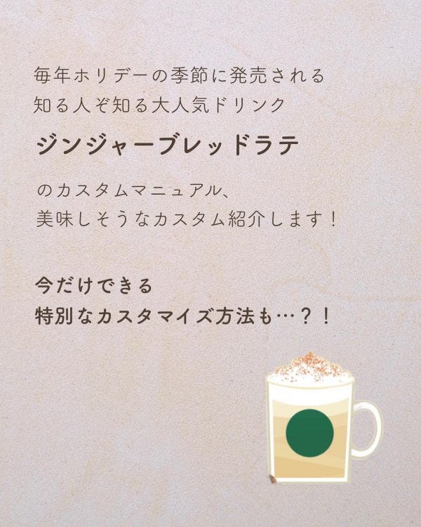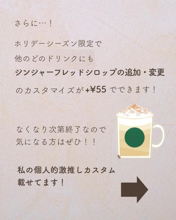 ホリデーシーズン限定で、他のドリンクにも「ジンジャーブレッドシロップの追加&変更」のカスタマイズが+¥55でできます◎