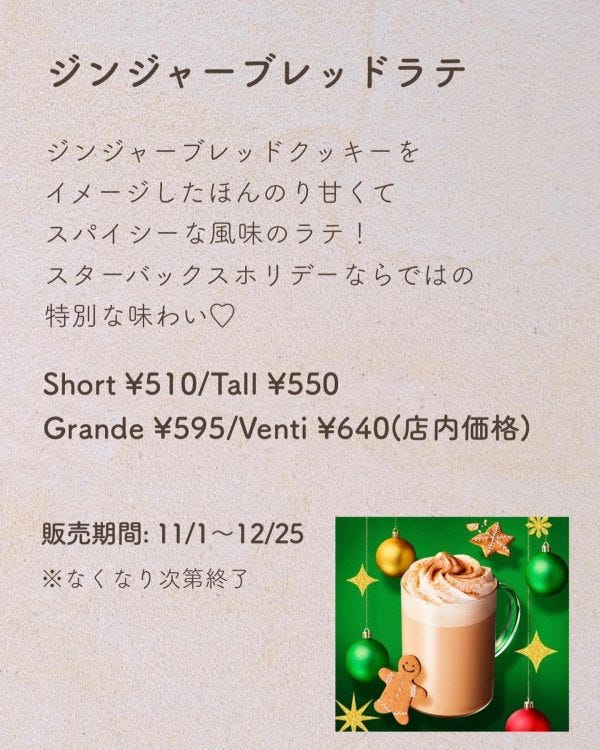ちなみに、ジンジャーブレッドラテはソイミルク変更がマイルドになっておすすめです◎