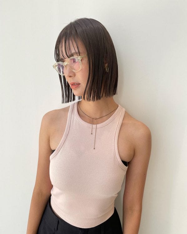 前髪ありのボブヘアスタイルはフェミニンな印象を与えますが、メガネをかけることで大人っぽくなり全体が引き締まります。