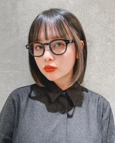 クリアメガネはもちろん黒ぶちメガネにも似合う髪型は、トレンド感満載のおしゃれな切りっぱなしボブヘアスタイルです。