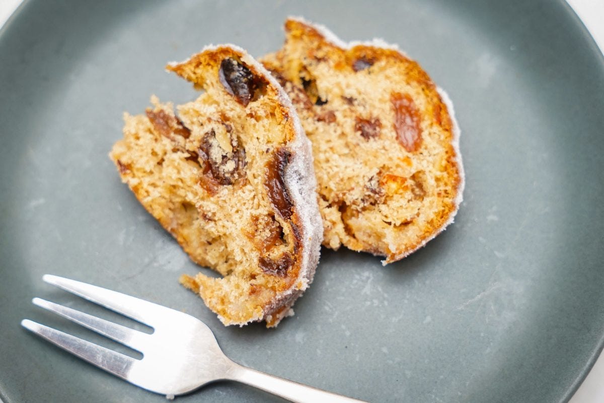 こぼれ落ちる砂糖に気をつけつつ、お好みのサイズにカットしていく。中にはぎっしりとレーズンやオレンジピール、アーモンドなどが入っていて贅沢な雰囲気が漂う。