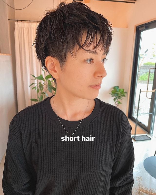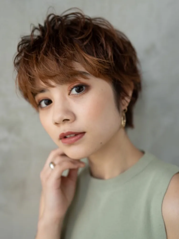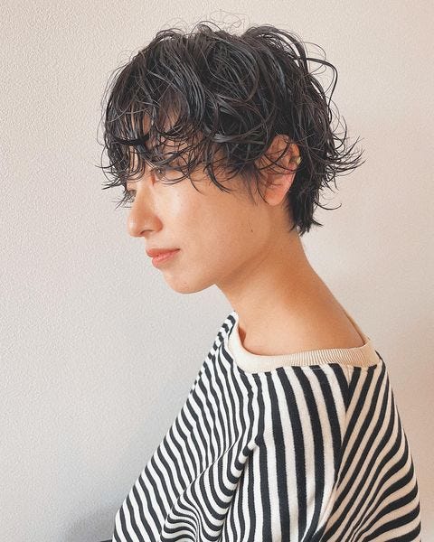 こちらは毛先にだけパーマをかけるワンカールパーマで、長く残した前髪のスタイリングがきれいに仕上がるベリーショートです。
