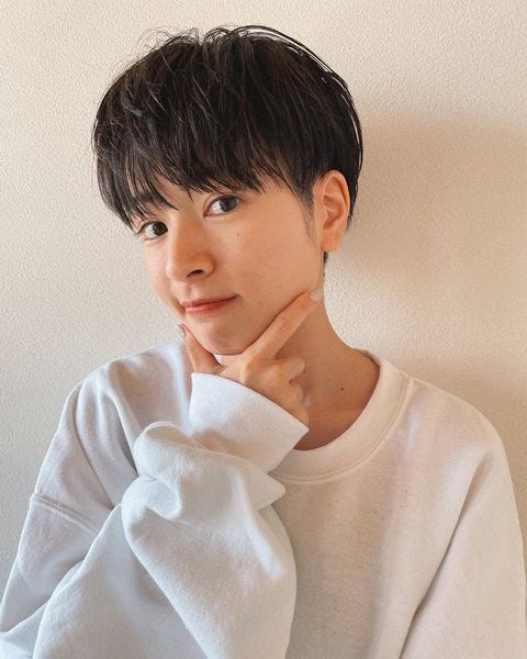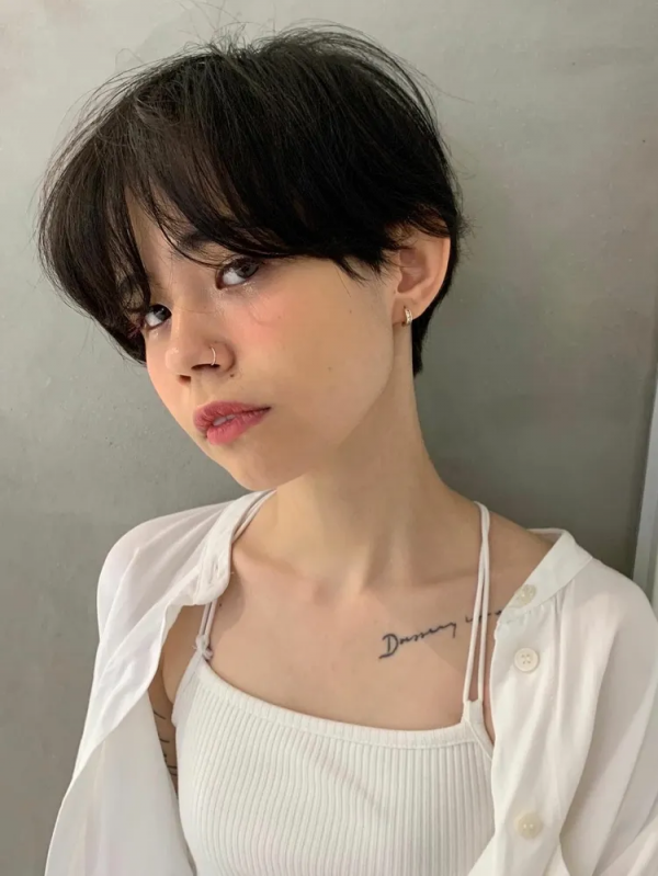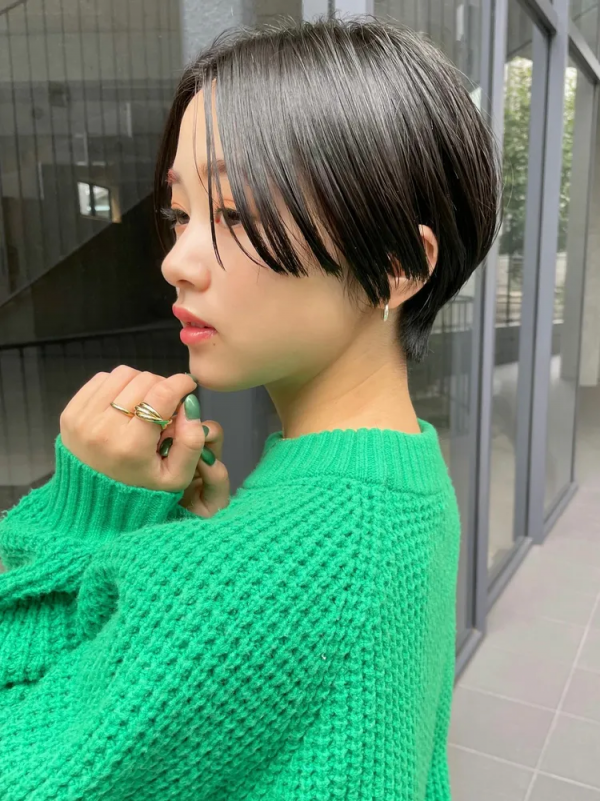 長め前髪でタイトにまとめたベリーショートは大人っぽいけれど、髪のツヤや透明感がイノセントな印象を作ってくれます。