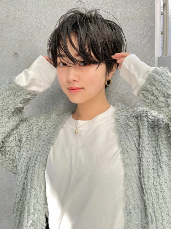 前髪とトップを長めにしているので、ドライな質感でふんわりとスタイリングすれば、ボリュームのあるベリーショートとしても楽しめるヘアスタイルです。