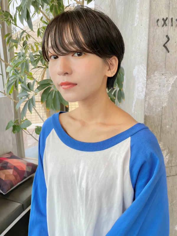 長めに残した前髪をサイドにつなげるように流すことで、暗髪にありがちな動きのなさをカバーしているベリーショートです。