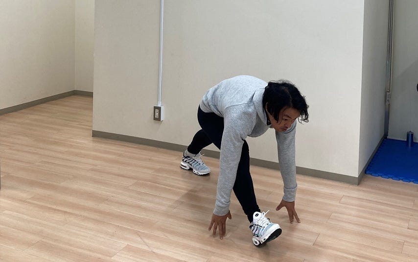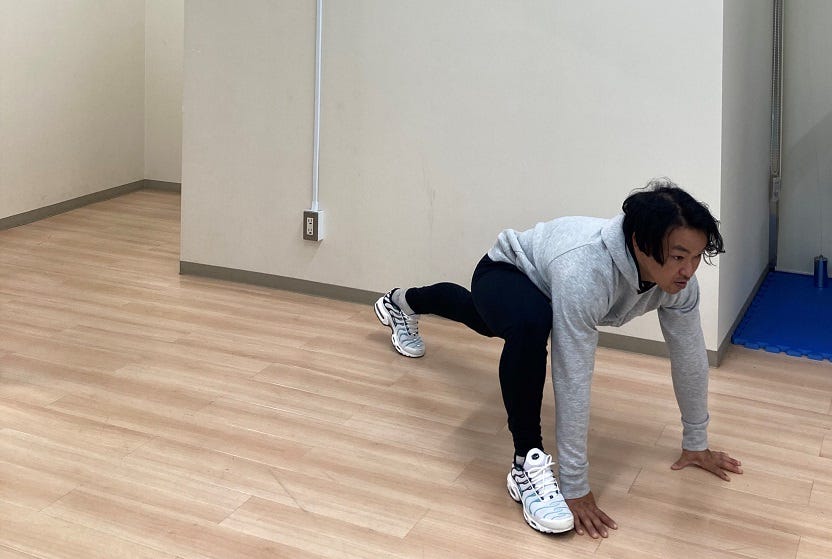 やり方立位の姿勢から大きく一歩踏み出し、両手を床につきます。このとき、頭からかかとまで一直線になるように意識しましょう。