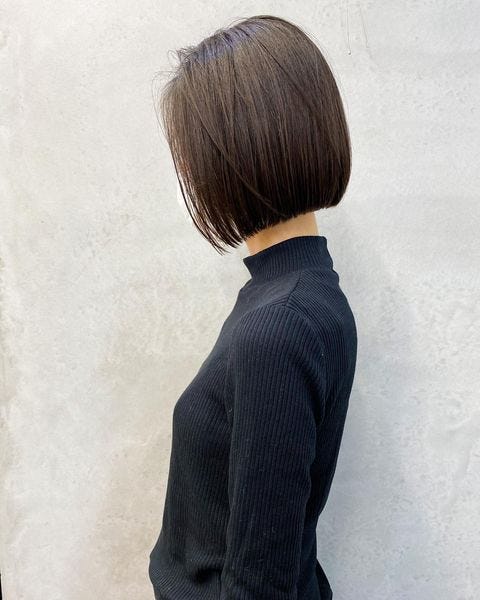 あごラインでぷつっとカットした大人可愛いコンパクトボブは、首が細く綺麗に見える人気の髪型です。