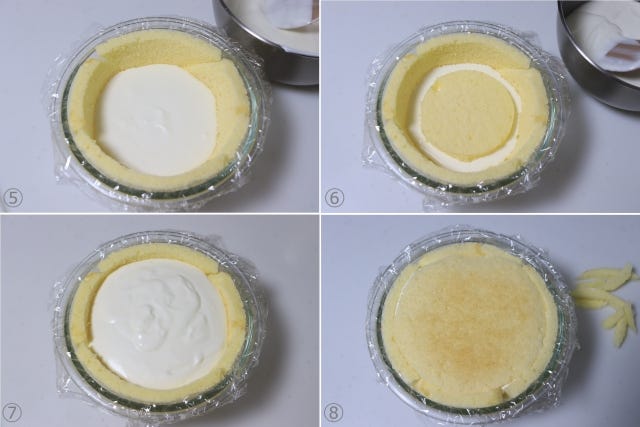⑧ 底用のスポンジを被せてフタをする(ぴったり収まるように端っこを少しそぎ落として下さい)。冷蔵庫に入れて冷やし固める。