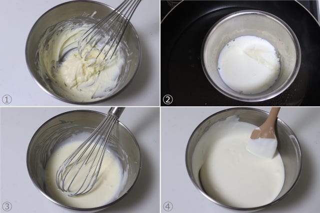 ・牛乳と無塩バターを合わせてボウルに入れ、湯せんにかけて温めておく。