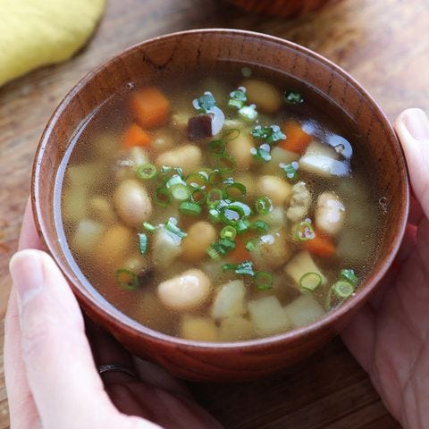 鶏そぼろや大豆など、鮭の炊き込みご飯とのバランスを整えるのに抜群な食材がたっぷり入った汁物レシピです。